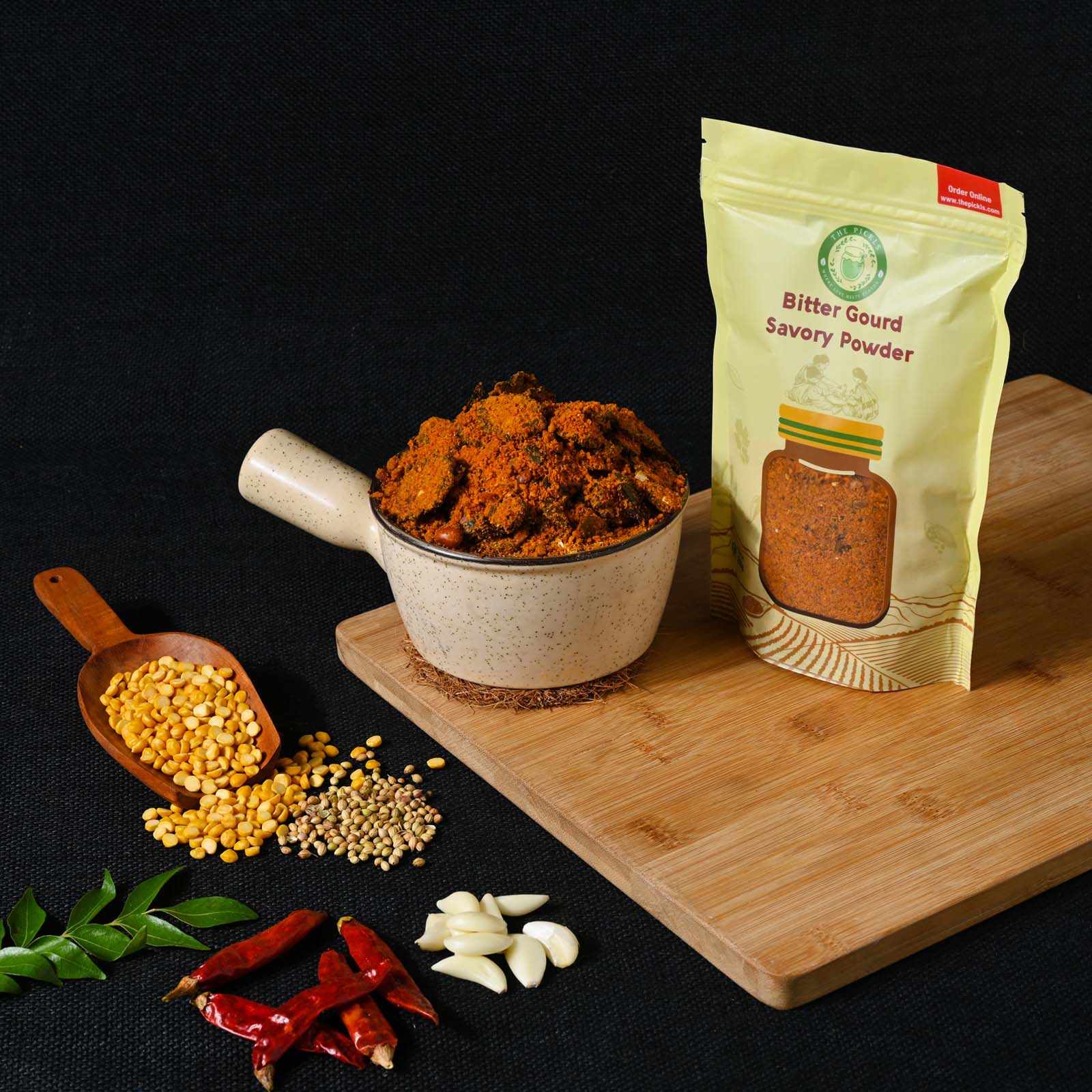 Bitter Gourd Savory Powder is a cherished Indian delight, combining jaggery, Bengal gram, and sesame seeds. This unique blend of sweet and savory flavors will delight your taste buds, while its satisfying crunch offers an enjoyable experience.