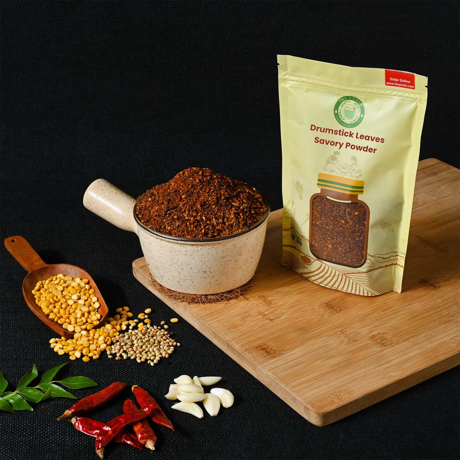 Discover our delicious Andhra Drumstick Leaves Savory Powder, a wholesome blend of spices and herbs. This delightful mix enhances the flavor of your meals while offering numerous health benefits. We prepare this unique spice blend using dried red chilies, Bengal gram dal, black urad dal, and aromatic curry leaves, which we roast in sunflower oil and finely grind to create a flavorful powder.